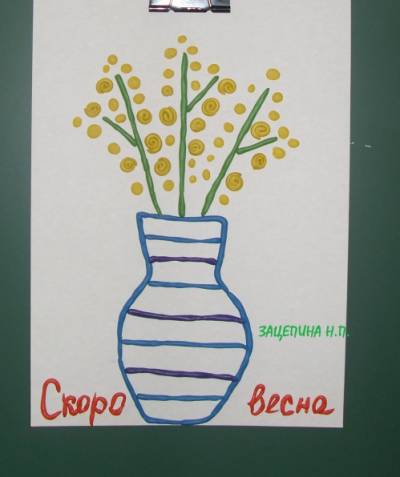 В нашей группе дети очень любят заниматься не только бумагопластикой но и пластилинографией. Хочу продемонстрировать одно из занятий. Дети по шаблону обвели вазу простым карандашом. И с помощью пластилина приступили к работе. Наша группа подготовительная и почти все читают. Было решено написать название нашей работы цветными карандашами. Некоторые так увлеклись что сделали это с помощью пластилина. Пластилин использовали на свой эстетический вкус, придерживаясь образца. Но фантазия у всех, как видите разная. Это очень радует и поднимает настроение. | |