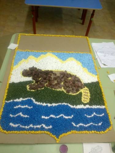 Предлагаю Вашему вниманию совместную работу с детьми старшего дошкольного возраста. Работу выполняем из бумажных салфеток, разрезанных на квадраты 2Х2 см. Салфетки разных цветов для разных фонов поделки - неба, воды, гор и бобра. Поделку выполняем на картоне 1, 5 метра на 1 метр. Сначала готовим материал - квадраты из наших салфеток сминаем в комочки (это по силам всем детям группы). Затем аккуратно прикрепляем к картону (на картоне заранее простым карандашом нарисован набросок работы). Прикрепляем комочки с помощью клея ПВА. Комочки желтого цвета крепим по контуру картины, чтобы выделить всю композицию. Хвост из комочков жёлтого цвета, облака - голубого, трава - зелёная. Самого бобра выполняем из двухсторонней бумаги коричневого цвета путём складывания квадратов размером 2, 5 Х 2, 5 см пополам 3 раза. Выпрямляем сложенный квадрат и угловой стороной крепим на клей. Это шерсть бобра. Квадраты крепим ближе друг к другу, что бы избежать "залысин". Вот такой бобёр у нас получился! Дети очень старались и получили колоссальное удовольствие. Работа коллективная. | |