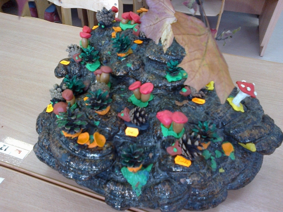 Творческие работы детей четвертого года жизни частенько ставят воспитателей «в тупик». Ну что может сотворить малыш! Мы только начинаем учить детей лепить прямыми и круговыми движениями ладоней, работать с клеем и наклеивать готовые заготовки, рисовать карандашом, краской и т. д. Воспитатели задумываются о том, какие поделки можно сделать с детьми четвертого года жизни, как их оформить, чтобы примитивная работа малыша выглядела красиво и привлекательно? Предлагаю вашему вниманию новую поделку с моими малышами - «Осенняя полянка». Подставкой для поделки послужил большущий гриб — трутовик (его размер, примерно 40x50 см.) . Работы каждого малыша расположены рядышком, маленькими группами. Так интереснее рассматривать и сразу можно найти свою. Здесь и грибочки, и ежики, и елочки. Ребята получили массу удовольствия, а поделка выглядит очень интересно. (У нас сейчас карантин, поэтому с в группе пусто) | |