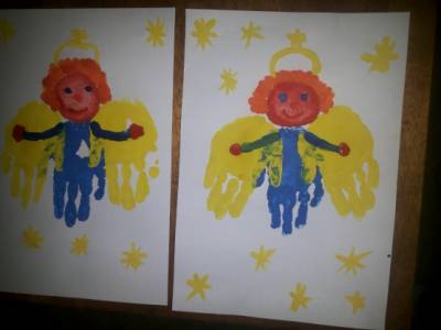 Чтобы сделать одеяние ангелочка, надо намазать ладонь голубой краской и оттисни её посреди выбранного листа бумаги. Теперь обе ладони намазать жёлтой краской. Оттисни обе ладони по обе стороны от одеяния, но немного ниже. Переверни лист бумаги. Намажь палец розовой краской и размазывая краску на листе по кругу, сделай розовую головку. Точно также, но голубой краской сделай ручки. Соедини их с одеянием. Не забудь пририсовать ладошки. Теперь окуни палец в оранжевую краску и сделай нашему ангелочку рыжие кудри. Над головой водрузи золотой нимб. Несколько точек, и готовы глазки и носик. Остаётся навести на личике ангелочка озорную улыбку. Окунув в краску палец, нарисуй звёздочки вокруг ангелочка. Приклей ангелочка к плотной бумаге, и вот вам превосходная рождественская открытка. | |