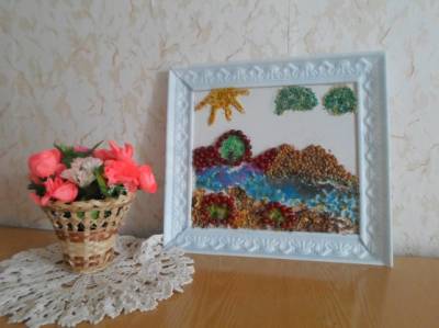 Художественное творчество играет значительную роль в развитии личности ребенка. Одним из его видов является аппликация - изобразительная техника, основанная на вырезании различных форм, предметов и наложении их на определенный фон. Аппликации из природного материала позволяют создавать необычные, интересные и красивые сюжеты. Примером этого служит работа "КРАСКИ ОСЕНИ" Цель: изготовление панно с использованием природного материала и круп. Задачи: - воспитывать аккуратность при работе с крупами, бережное отношение к природе и её дарам; - развивать мелкую моторику, творческое воображение, художественный вкус; - учить комбинировать разные виды круп, листвы и др. природных материалов. Материалы:крупы (манная, рисовая, пшено, чечевица, сухие листья, плоды калины, гуашь и клей ПВА, пластиковая основа, рамка. | |